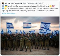 Under hele krigen har der været rapporter om jødiske individer, der kæmper mod russerne, men da som en del af Ukraines regulære styrker eller som en del af de frivillige bataljoner. Flere israelske medier rapporterer nu, at instruktører fra de israelske specialstyrker er i Ukraine for at træne civilbefolkningen i krigsførelse mod Rusland. Avisen Yedioth Ahronoth har blandt andet interviewet en af instruktørerne, der forklarer noget af motivationen for dette.