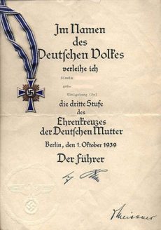 Den 16. december 1938 introducerede Adolf Hitler udmærkelsen Moderkorset, den tyske mors hæderstegn. Fortjenstmedaljen blev tildelt årligt den anden søndag i maj (mors dag) og den 12. august, Klara Hitlers (Hitlers mor) fødselsdag.