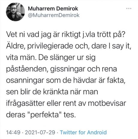 ANTI-HVID RACISME: En mand fra Tyrkiet, der tilhører det svenske Centerpartis partiledelse, kommunalrådet i Linköping kommune samt en flittig anti-hvid Twitter-bruger, er »træt af« hvide mænd.